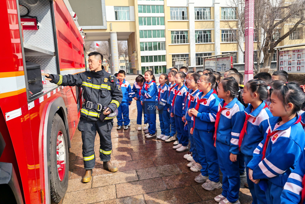 近日,新疆维吾尔自治区昌吉回族自治州呼图壁县消防救援大队联合县教育局、昌吉州青少年示范性综合实践基地,走进该县第一小学教育集团东风校区,开展“消防知识进校园 安全守护伴童年”主题宣传活动,为千余名师生送上沉浸式消防安全课,全面筑牢校园消防安全防线。(记者 潘从武 通讯员 马海东 洪文乐 摄)